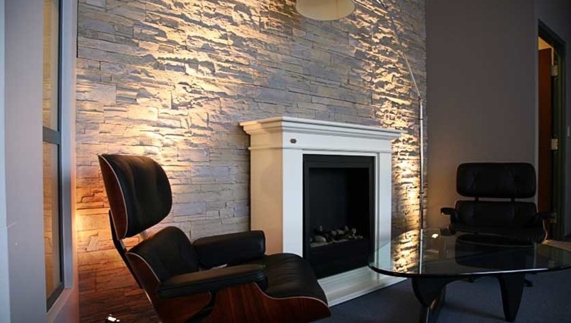 If you are lucky enough to have a very large living room with high ceilings, consider placing your fireplace as a stone column in the centre of the room. The Stone-like Strata earthy decorative panel will provide you with the perfect framework to make the fireplace the focal point of your décor concept.