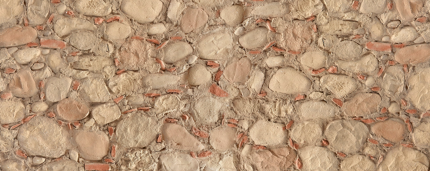 Este panel decorativo imita la mezcla de piedra de río y restos de teja, que era una forma de construir en los entornos rurales.