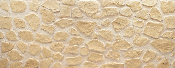 Grandes y pequeños bloques irregulares y redondeados de imitación piedra forman el diseño del panel decorativo Mampostería, de apariencia natural y rústica, con diferencias en el color de las juntas.